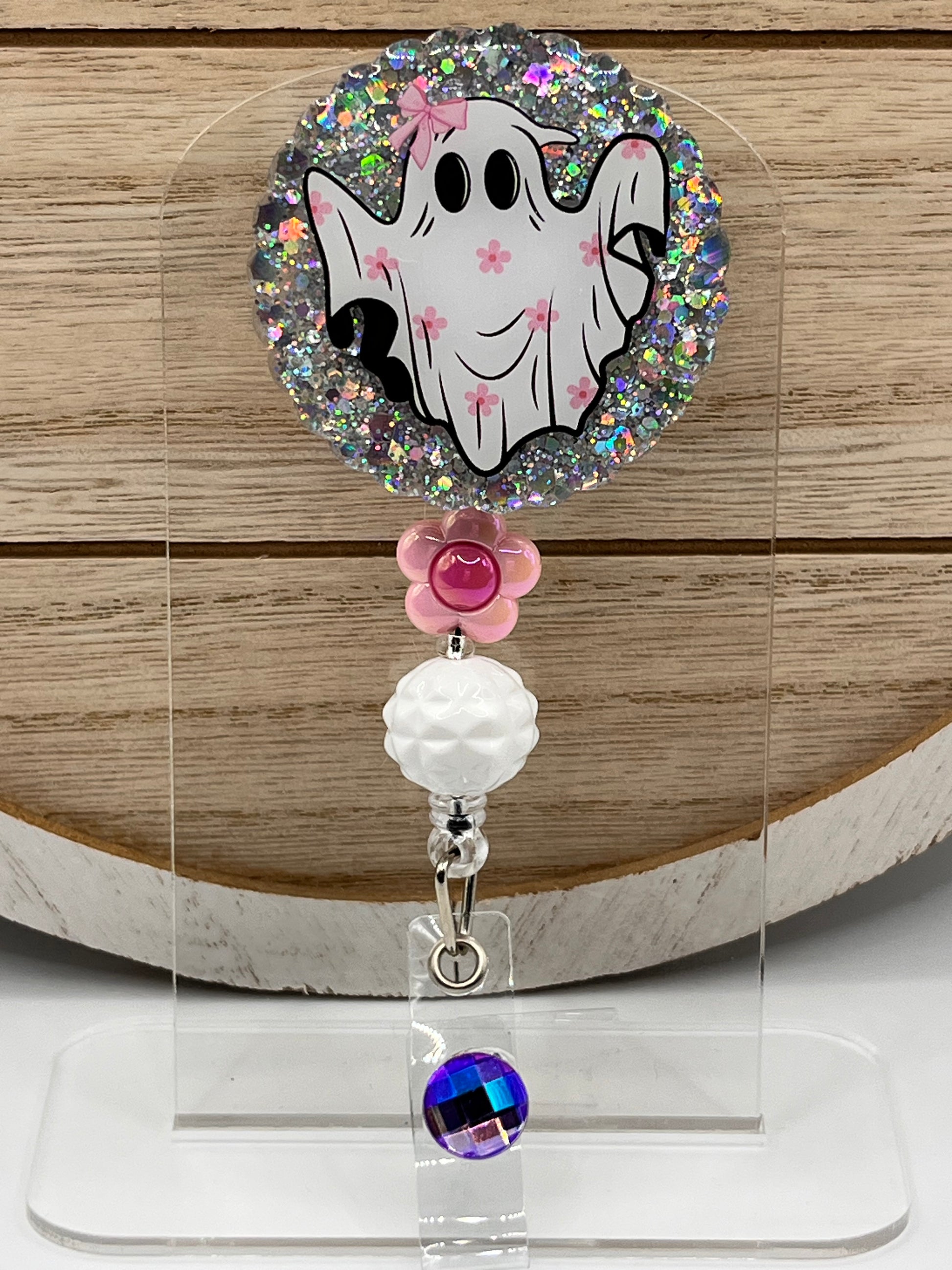 2 inch acrylic badge reel with alligator clasp.